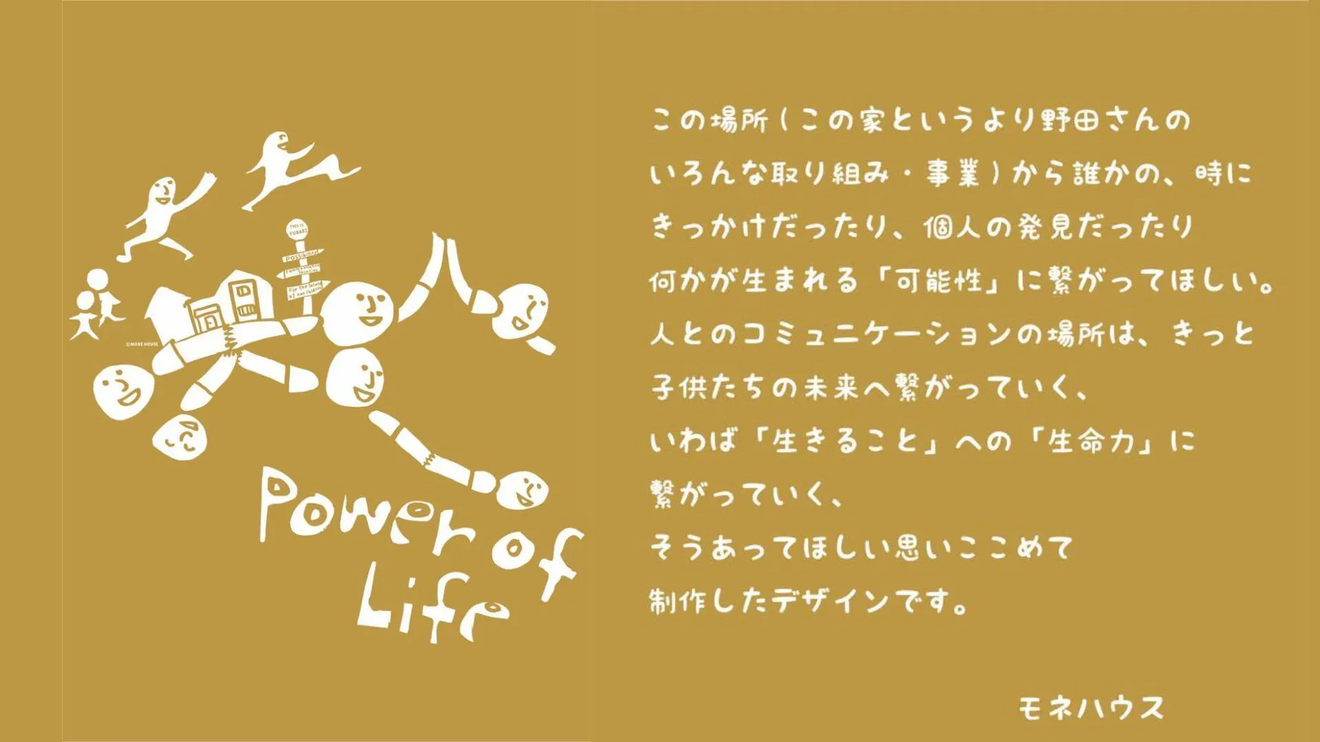 この場所(野田さんの様々な取り組み、事業)から誰かのきっかけだったり、個人の発見だったり、何かが生まれる「可能性」につながってほしい。人とのコミュニケーションの場所は、きっと子供たちの未来へつながっていく。いわば生きることへの生命力につながっていく。そうあって欲しい思いを込めて制作したデザインです。