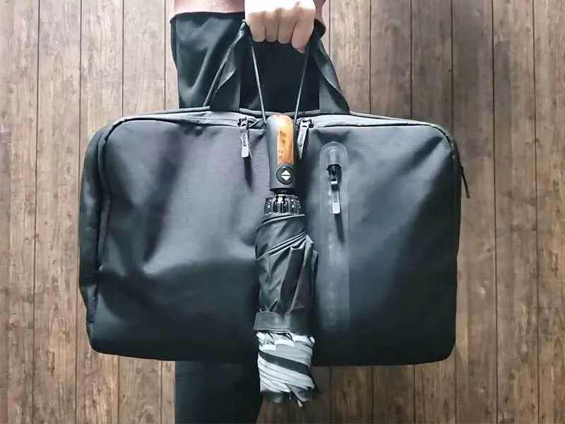 たしかに従来品だと手ぶらでは問題ないのですが、大きい荷物を持っていると濡らしてしまうことがあります。