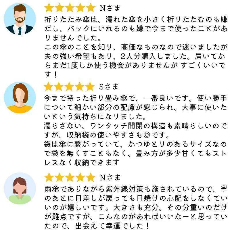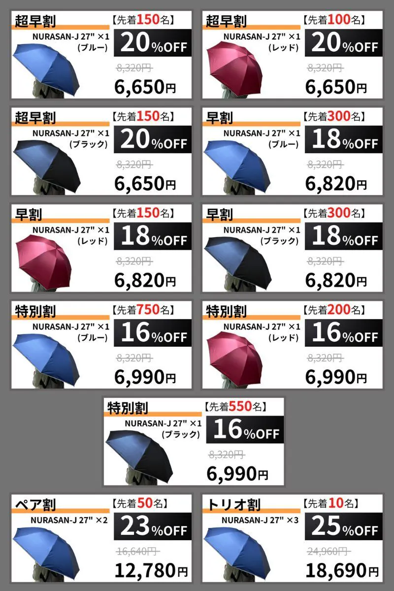 2026/03/20 12:00支援者のみなさまいつもプロジェクトの応援ありがとうございます。本日12時より雨×暑×風対応の120㎝ワイドな傘【NURASAN-J27Ws】の第3弾限定販売がはじまりました!累計1,280万円、のべ1,300名を超える方々にご支援いただいたシリーズ最強の晴雨兼用傘!年々暑くなる夏、急に降り始めるゲリラ豪雨に突風。あなたも悩まされていませんか!?そんな場面も“この1本”で解決。職場や車に予備として、バッグに忍ばせていざというときに、メインの傘としてももちろんお使いいただける1本。NURASANシリーズをご愛用している方の声もご紹介しますのでぜひチェックしてください!4色展開でお待ちしております。▶【販売会場はこちら】>>レビューコメントはこちら もっと見る