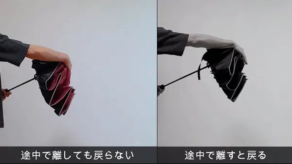 縮める途中で手を離してもストッパーが効いて飛び出しません。傘をたたんでしまうための負荷を低減しました。