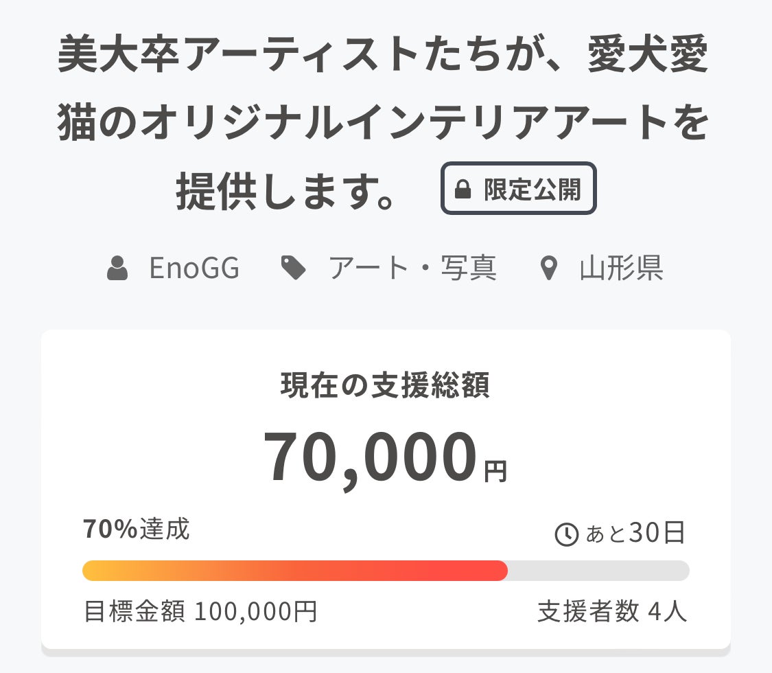 【開始24時間で70%達成】皆さん おばんです。Enogg株式会社の駿斗ことバンクシーです。先日12時より新しいプロジェクト【ANIMAL ART】が始動しました!https://camp-fire.jp/projects/view/705235本当にありがたい事に開始24時間以内で70%(支援者4名)を突破!!ここから準備してきたモノをドンドン発信して行きますよー!1人でも多くの愛犬家愛猫家の皆様へこのプロジェクトを見て・知って貰えるよう11月30日まで走って行きます。【ご支援】【シェア】の程よろしくお願いいたします!!