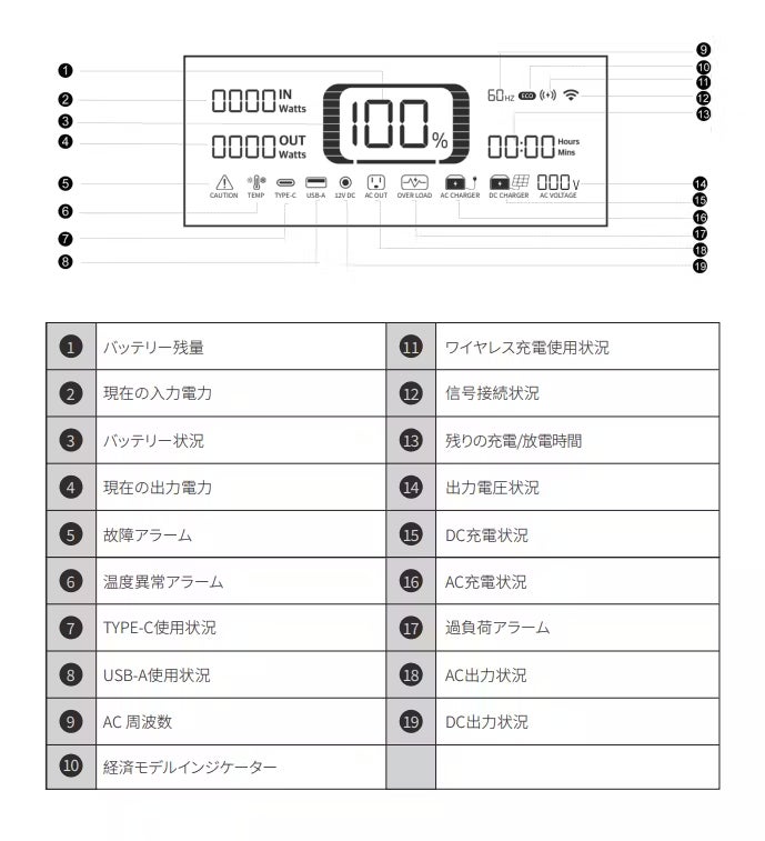 Q4:どのデバイスにも接続していないのに、なぜバッテリーが切れるのですか?AC出力スイッチまたはDC出力スイッチがオンになっている場合、本製品がデバイスの充電に使われていなくても、多少の電力消費は発生しています。これは正常な状態です。この状態にならないようにするには、本製品を使用していないときは、随時AC出力およびDC出力スイッチをオフにしてください。また、対応するスイッチが消灯している場合、出力は無効になります。