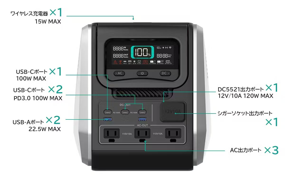 本製品のUSB-Cポート2およびUSB-Cポート3(左から二つ目と三つ目)はPD双方向急速充電プロトコルをサポートしており、同時に直流出力ポートおよび直流入力ポートとして使用できます。