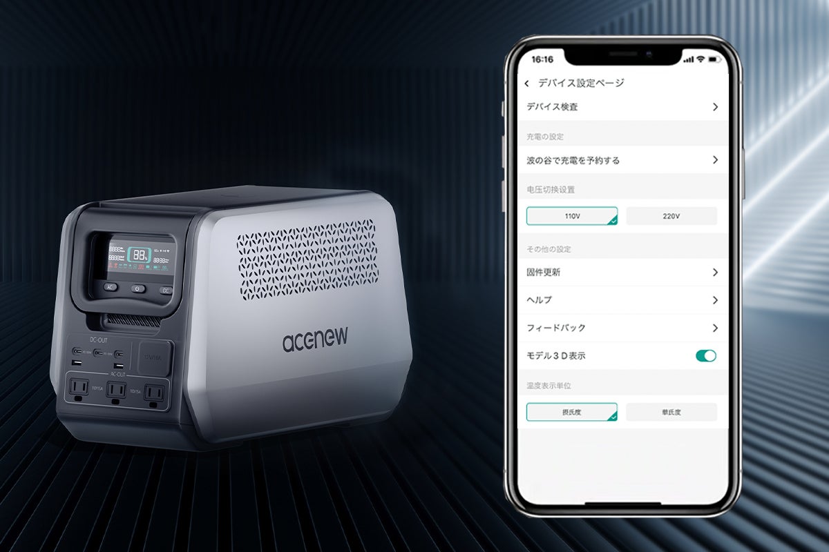 Neutron 1200は専用アプリでスマートフォンからリモート操作することが可能です。BluetoothあるいはQRコードをスキャンしてAcenewとスマートフォンを接続し、バッテリー残量と充電時間を確認できます。また、必要に応じて110v/220vの電圧変換、出力をオン/オフにすることもできます。