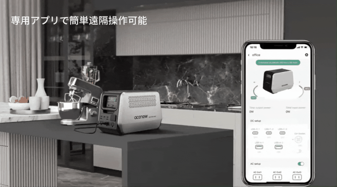 Neutron 1200は専用アプリでスマートフォンからリモート操作することが可能です。BluetoothあるいはQRコードをスキャンしてAcenewとスマートフォンを接続し、バッテリー残量と充電時間を確認できます。また、必要に応じて110v/220vの電圧変換、出力をオン/オフにすることもできます。