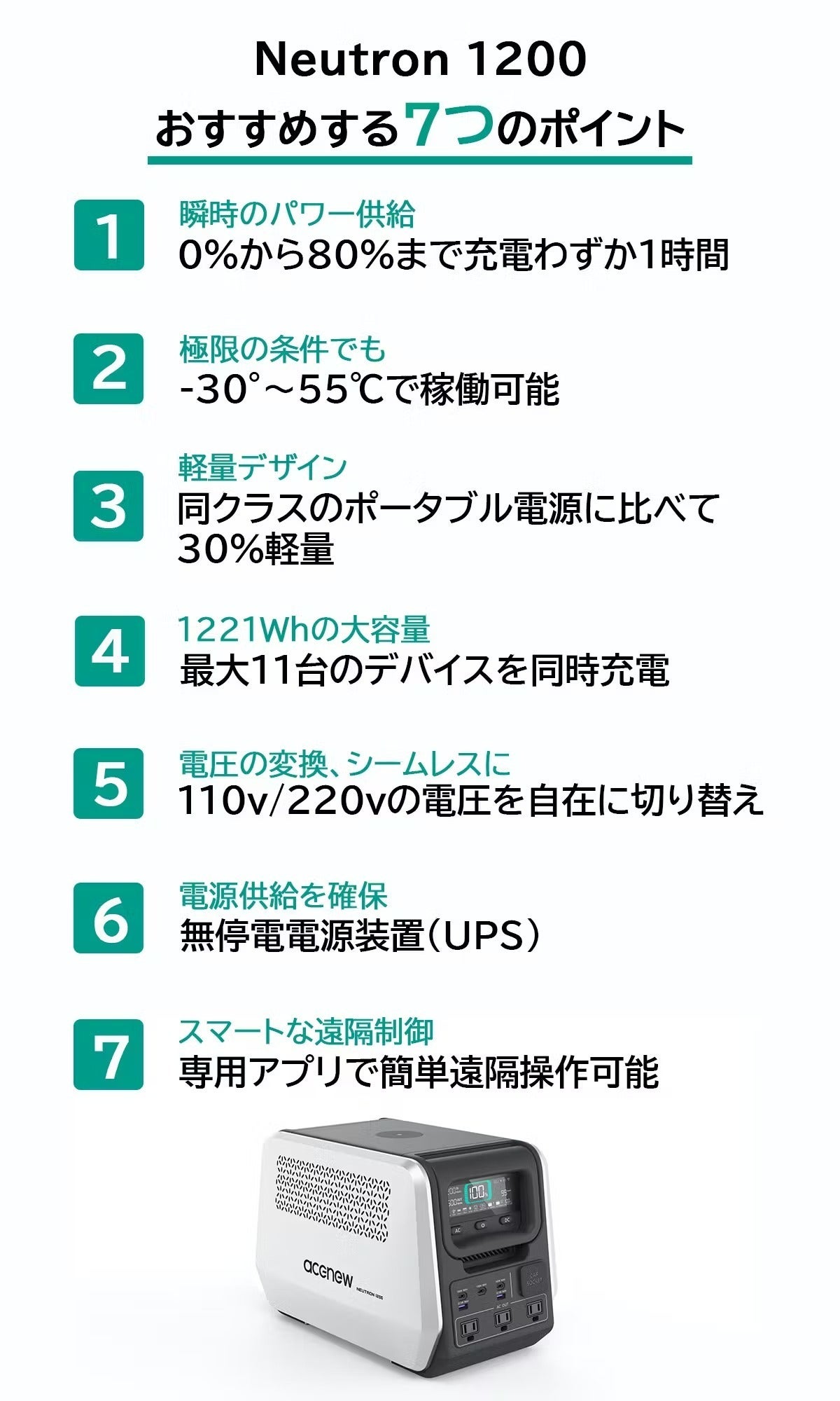Neutron 1200は、耐寒耐熱性において、厳しい環境条件下でも優れたパフォーマンスを発揮します。極端な温度変化や厳しい気象条件においても、安定的に電力を供給し、あなたのニーズに応えます。