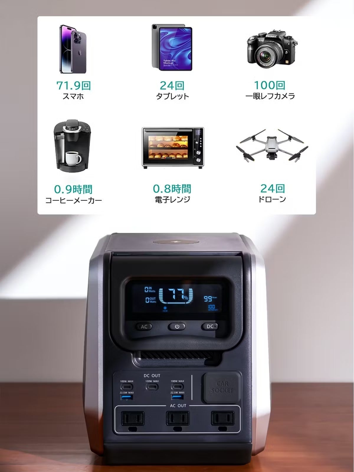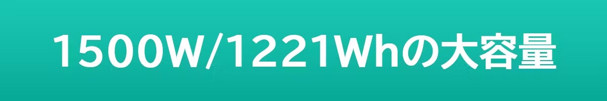 1500W/1221Whの大容量で、照明、電子レンジ、冷蔵庫など、生活に必要なほぼすべての電化製品に安定して電力供給が可能です。万が一のために、防災用品に最低1個はほしい必需品です。