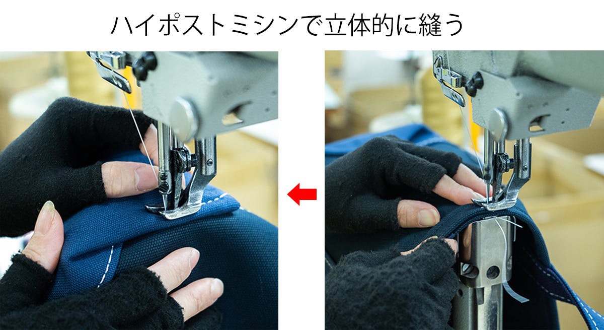細い棒の先端を軸にして縫うハイポストミシンを使い、トートバッグを立体的に縫います。スピードと角度を調整しながら、地厚な帆布を重ね合わせた三角形を縫製していきます。やり直しのきかない職人技です。