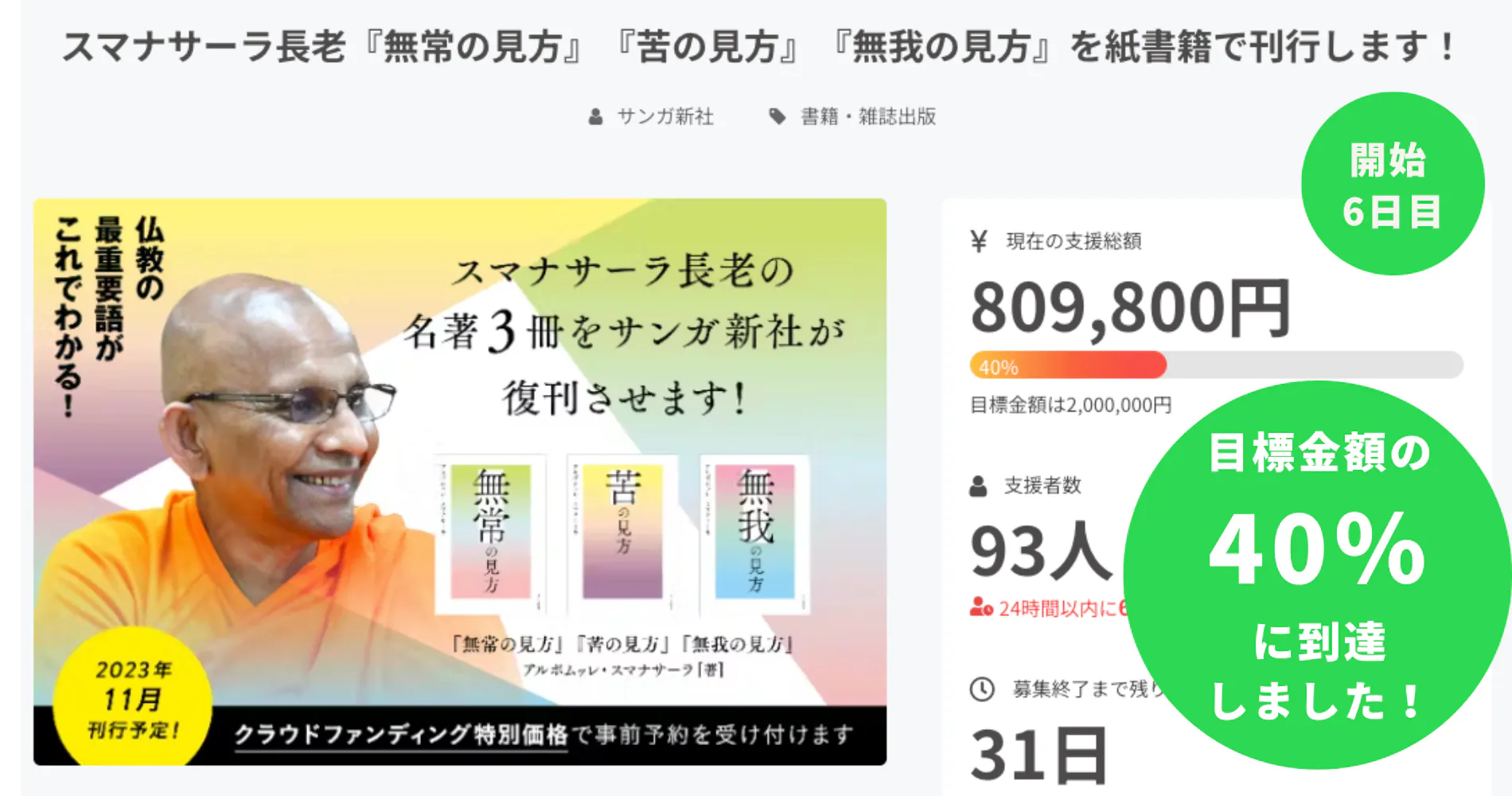 9月30日(土)午前7時にスタートした「スマナサーラ長老『無常の見方』『苦の見方』『無我の見方』を紙書籍で刊行します!」クラウドファンディングは、6日目となる10月5日(木)、ご支援人数が90人を超え、目標金額の40%となる「支援金額80万円」を突破することができました。たくさんの応援とお申込みを本当にありがとうございます!