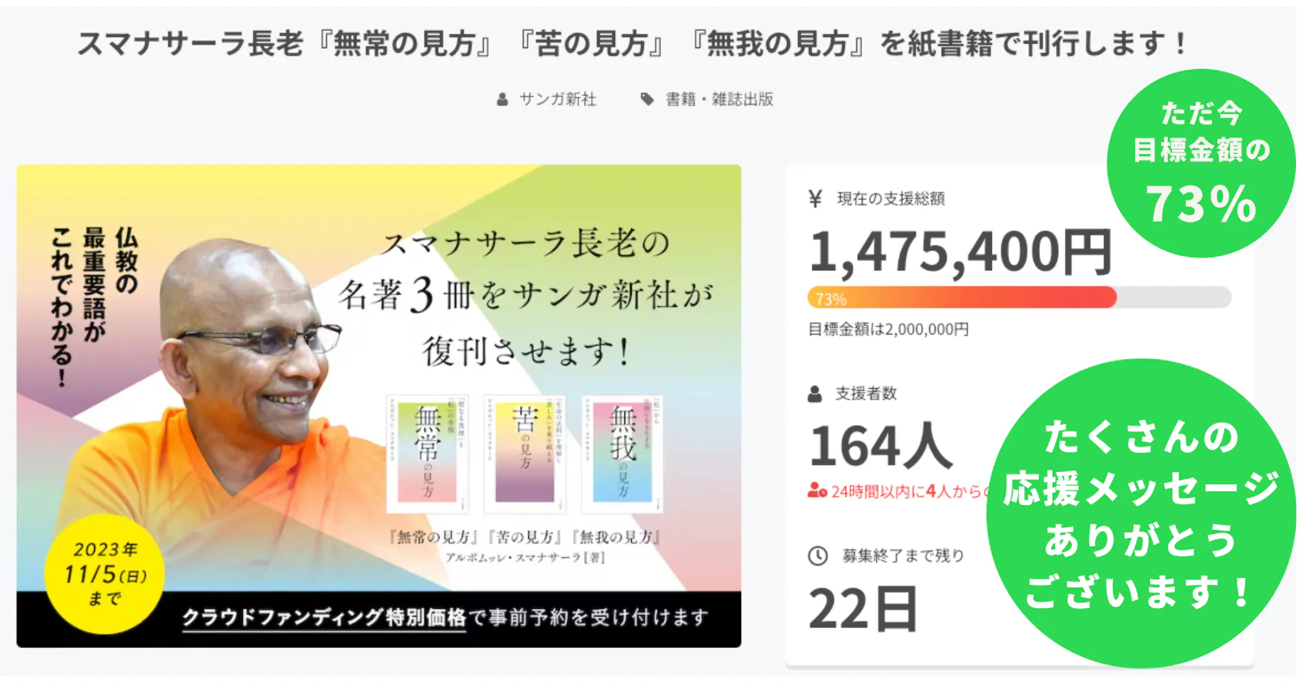 「スマナサーラ長老『無常の見方』『苦の見方』『無我の見方』を紙書籍で刊行します!」クラウドファンディングの締切は、「2023年11月5日(日)まで」です。