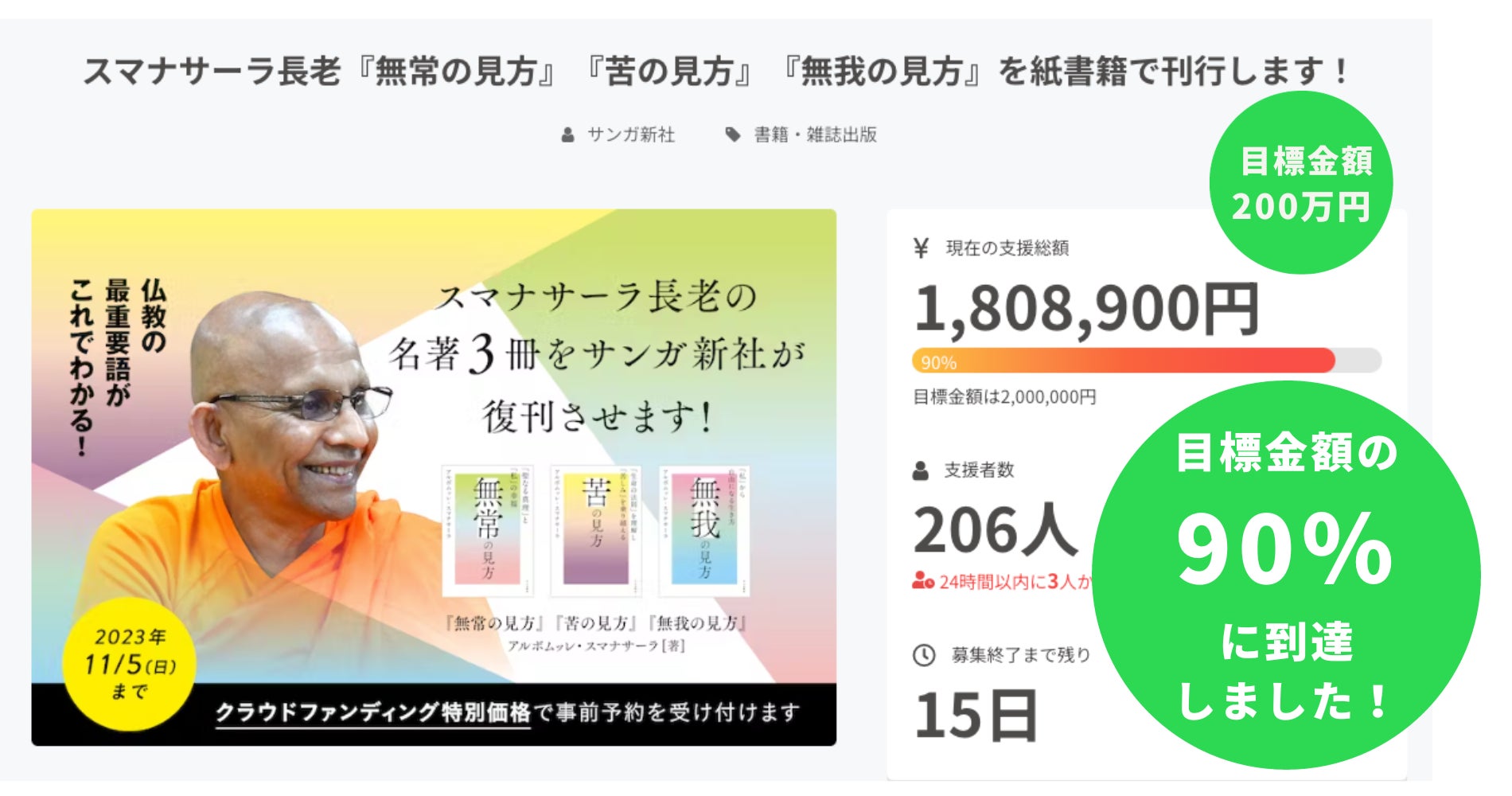 アルボムッレ・スマナサーラ長老の『無常の見方』『苦の見方』『無我の見方』事前予約クラウドファンディングは、本日10月21日(土)9時時点で、支援総額が180万円を超えました!