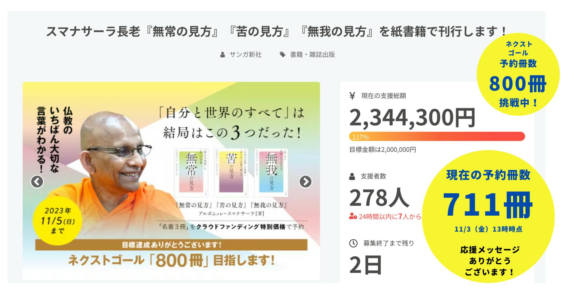 9月30日から実施している「スマナサーラ長老『無常の見方』『苦の見方』『無我の見方』を紙書籍で刊行します!」のクラウドファンディングは、目標金額の200万円を突破し、現在、ネクストゴールとして「予約冊数 800冊」を目指しています。