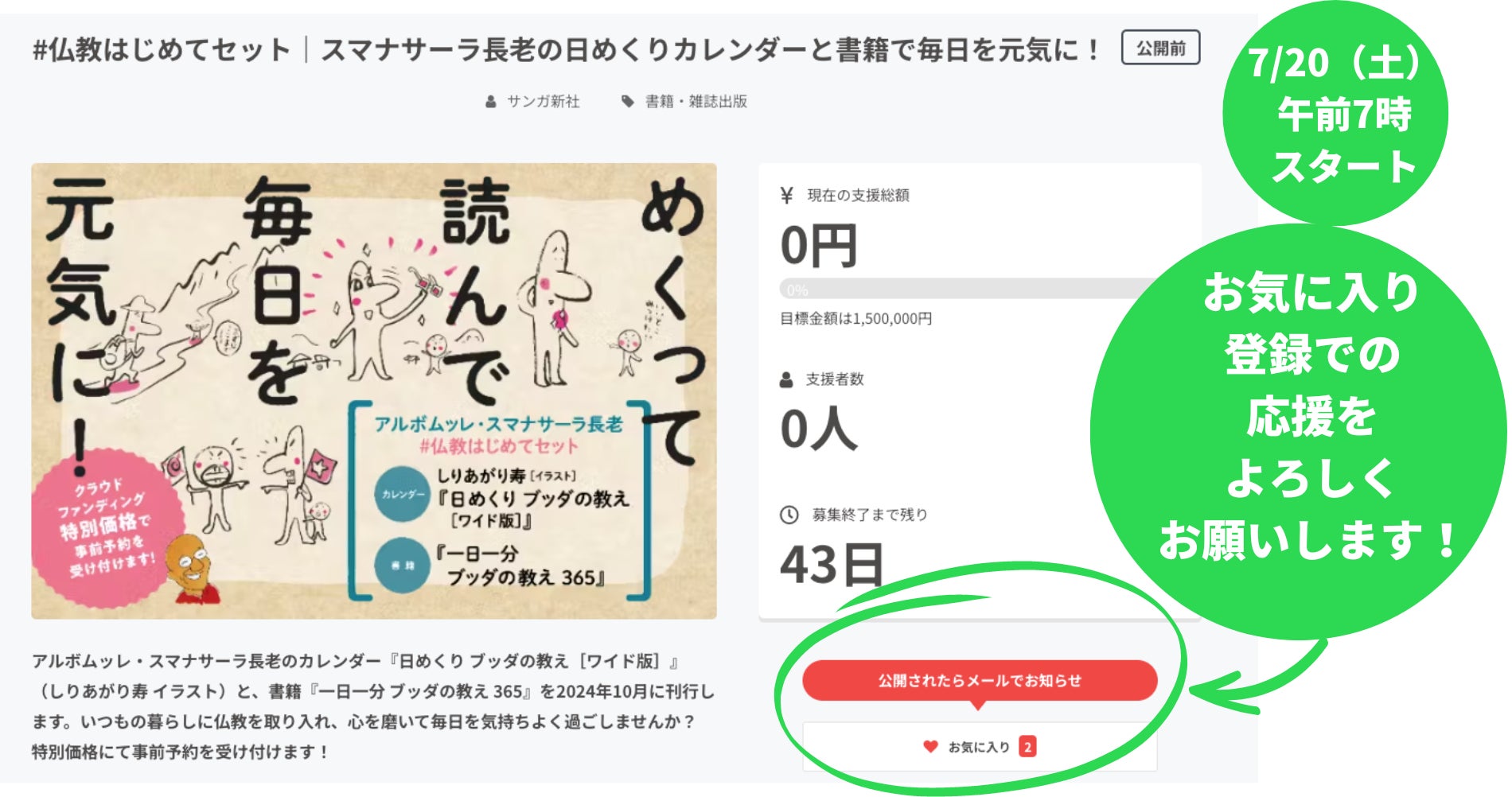 スマナサーラ長老の日めくりカレンダーと書籍を刊行するクラウドファンディングは、「7月20日(土)午前7時」にスタートします。