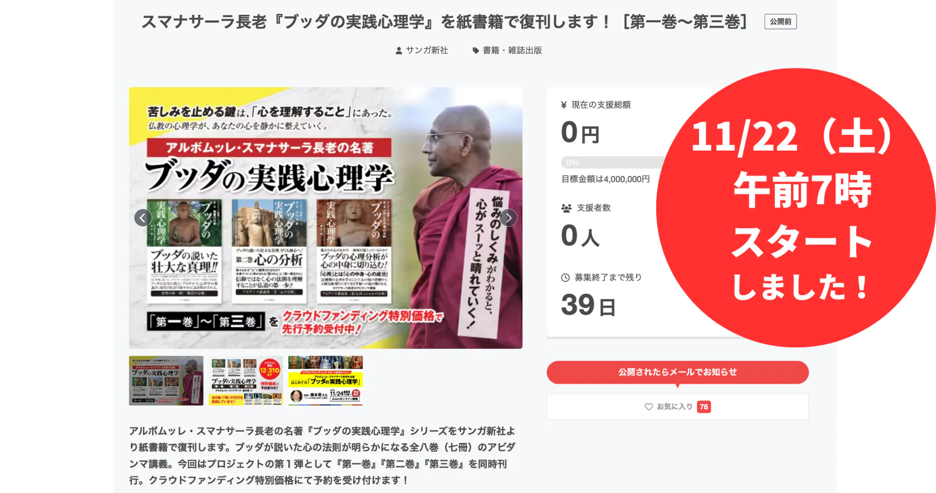 スマナサーラ長老による智慧の体系『ブッダの実戦心理学』は、まさに今こそ必要とされています。不安が尽きない時代だからこそ、心を整える教えを再び手に取っていただきたい。この復刊は、その第一歩です。どうか応援をよろしくお願いいたします。