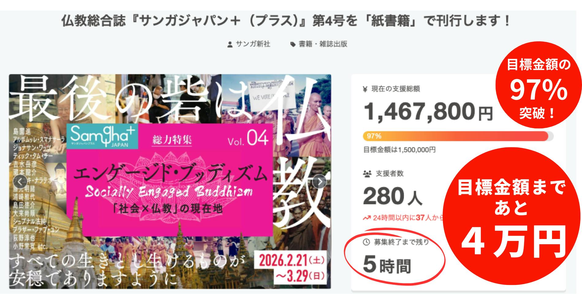 2026年5月末に刊行予定の仏教総合誌『サンガジャパン+』第4号は、本日「3月29日(日)23:59」までクラウドファンディングで事前予約を受け付けています。いよいよ最後の数時間となりました。
