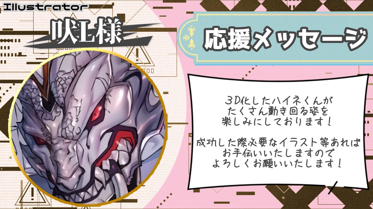 旅動画や、自作のピザ窯を使ってピザを作る動画も、歌配信も、DJ配信も、雑談配信だって3Dであれば、もっと違う演出が出来たり、今までやれなかった企画も出来るようになります。そのために、このプロジェクトを成功させ、3Dの姿でもっと自分の良さを引き出し、もっと皆さんと楽しい時間を一緒に過ごしたいと思っています。