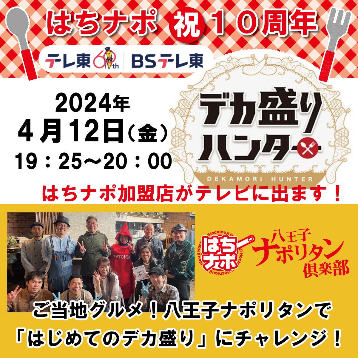こんにちは。 桜が満開ですね!皆様の地域はいかがでしょうか。今日は、はちナポチームが、テレビに映るというニュースです。なんと、「デカ盛りハンター」テレビ東京の番組に出ます。4月12日(金曜)夜19:25〜この番組は、大食いのタレントさんが、大食いのデカ盛りに挑んだり、人気チェーン店や行列店、海外のグルメを全部食べまくる!という番組ですが、加盟店にはデカ盛りを提供する店舗は「0」です 。 。 。なのに、オファーを頂きました。八王子ナポリタン倶楽部の加盟店の数店舗にご協力を得て、番組的にも初の試みになる構成だそうです。どのような放送になるのか、とても楽しみです!皆様もチェックをお願いします!