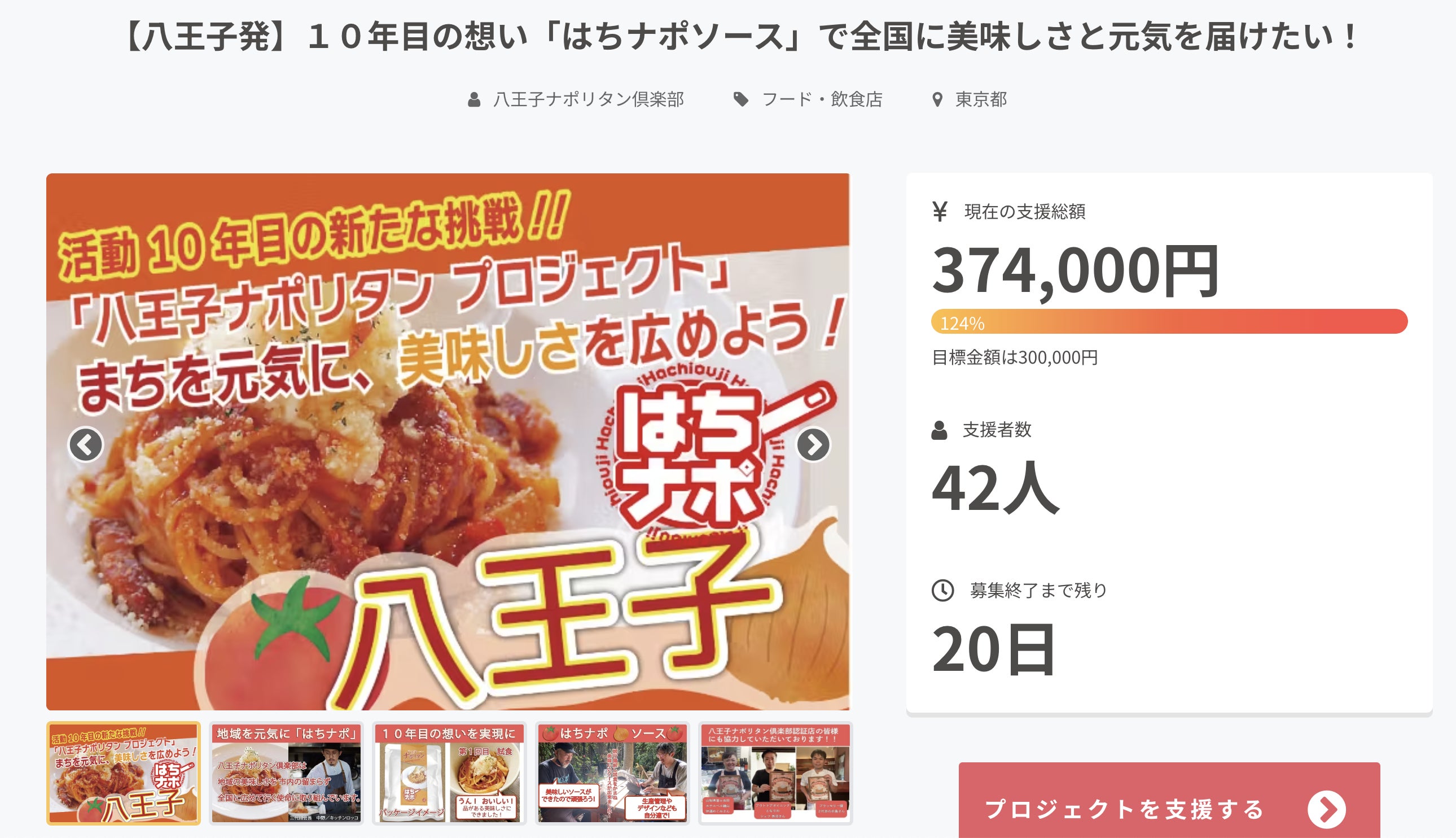 ありがとうございます!!目標金額達成いたしました!ご支援いただいた方々、ご覧いただい方々、本当にありがとうございます。手探りで、不安の中、クラウドファンディングを立ち上げましたが、ご支援していただいて、驚きとともに感謝の気持ちでいっぱいです。引き続きご支援いただけると嬉しいです。期間中は、イベントの出展や、メディアへの露出などを行っていきます。またご報告をいたします。まずは、御礼まで。八王子ナポリタン倶楽部より