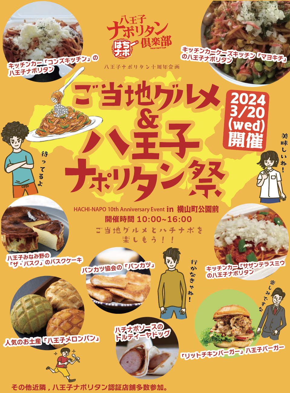 こんにちは!3月20日(祝水曜)は、『ご当地グルメ&八王子ナポリタン祭』を開催(主催)します!お陰様で、当クラブは10周年になりました。そこで、初の試み、八王子駅北口、西放射線通りの終わり「横山町公園」にてイベントを開催します。10:00〜16:00 近隣のはちナポ加盟店、キッチンカー、そして、八王子のご当地グルメも出店します。はちナポの出店店舗ではちナポをご注文いただいた方にオリジナルのステッカーをプレゼント!是非、お立ち寄りください。詳しくはこちら https://www.8napo.com/event-info/お待ちしております。