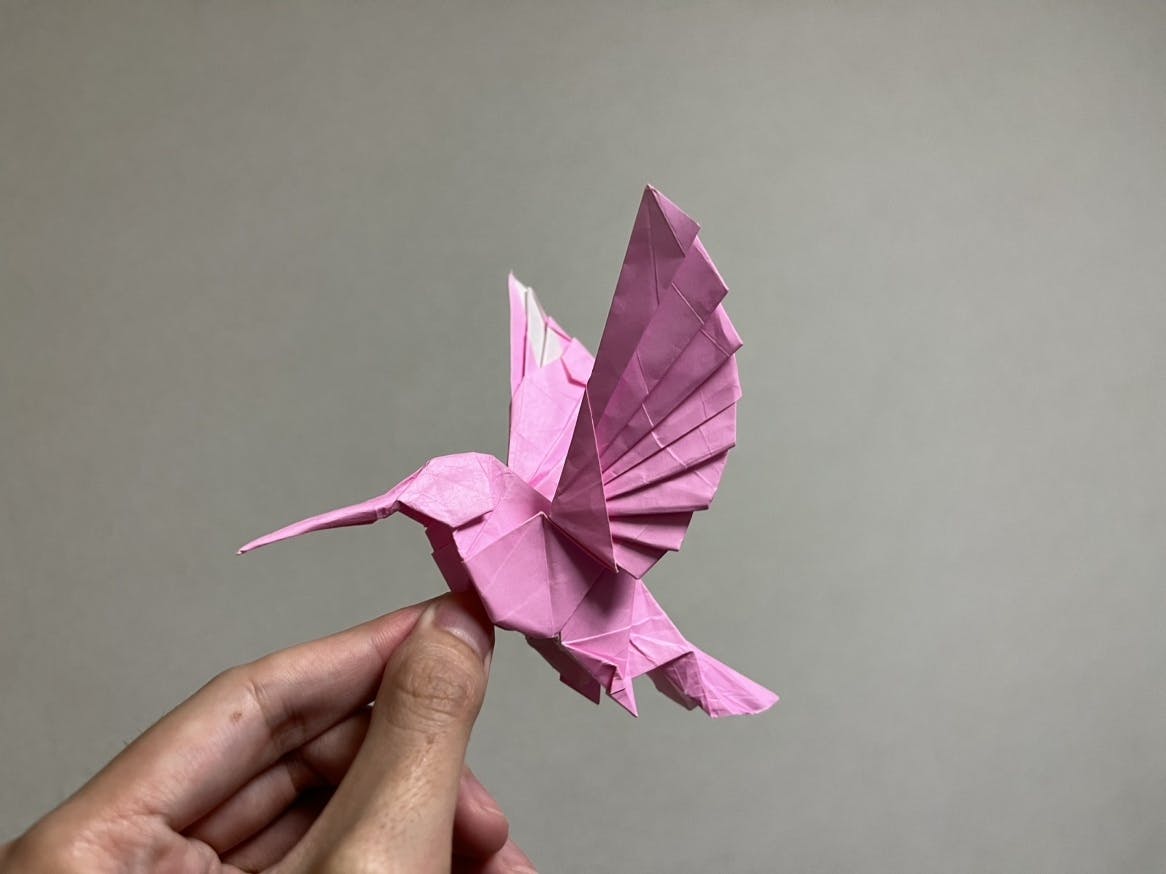 配信では、ナイフのような輪郭をしたハチドリの羽を折り出すためのパーツを作成し、それを正方形の紙に配置するまでの流れが語られています。