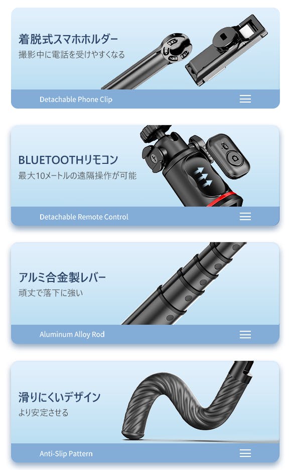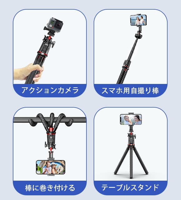 さらに安定した卓上三脚スタンドから、簡単に持ち運びに便利な自撮り棒や携帯用のアクションカメラ用スタンドなどにもなります。