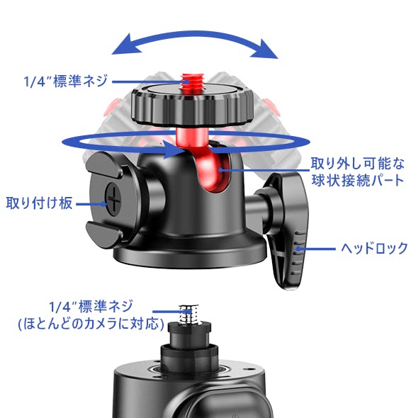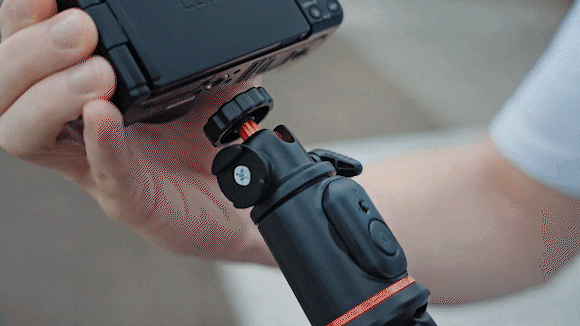 6. 互換性の高い1/4"ネジを搭載し、アクションカメラなどとの組み合わせも可能