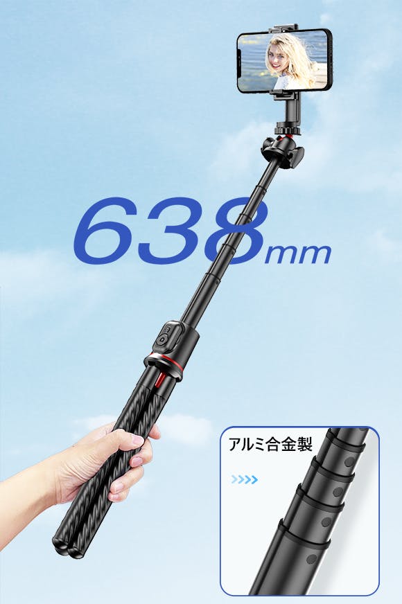 最大638mmまで伸びる、圧倒的な安定性を誇るアルミ合金製レバーにより、安全で滑りにくい撮影体験をご提供します。いつどこでもブレのない画像や動画を簡単に捉えることができます。