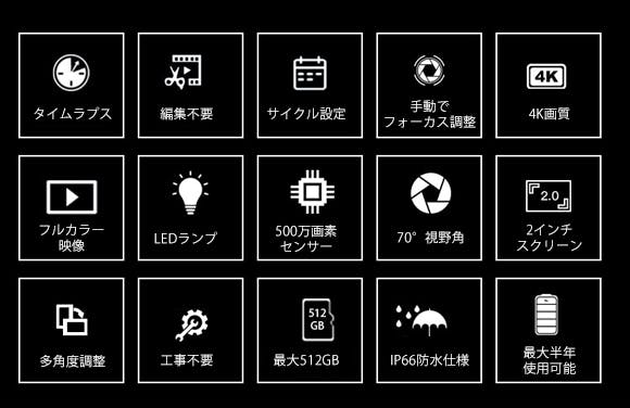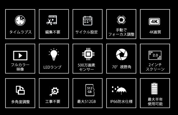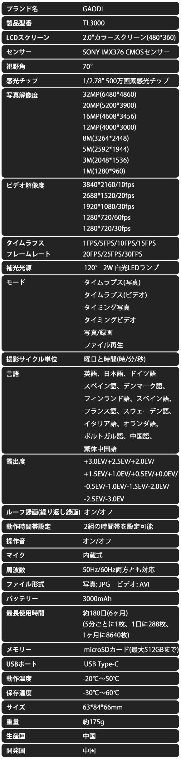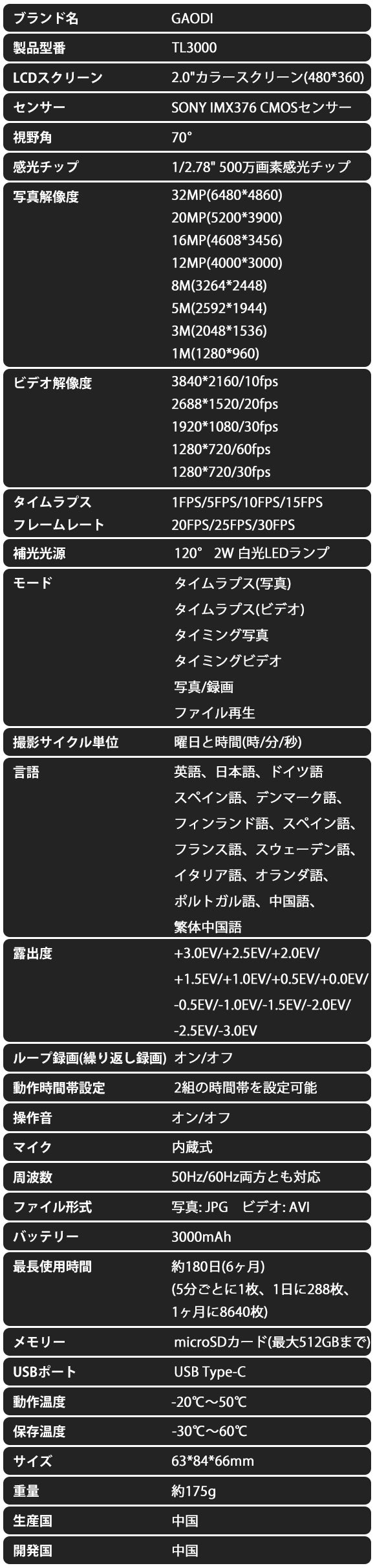 「TL3000」は3000mAh大容量バッテリーを使用しており、最大180日間連続で記録できます。植物の成長や空・雲の変化など、長時間の記録が必要なタイムラプス撮影にはうってつけです。