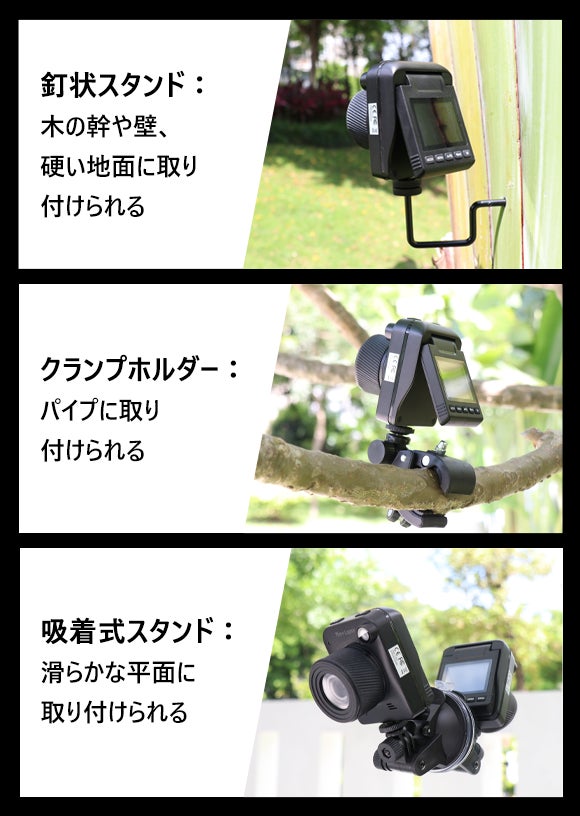 さらに釘状スタンド、クランプホルダーと吸着式スタンドの3種のスタンドが付属されており、さまざまなシーンに合わせて活用できます。