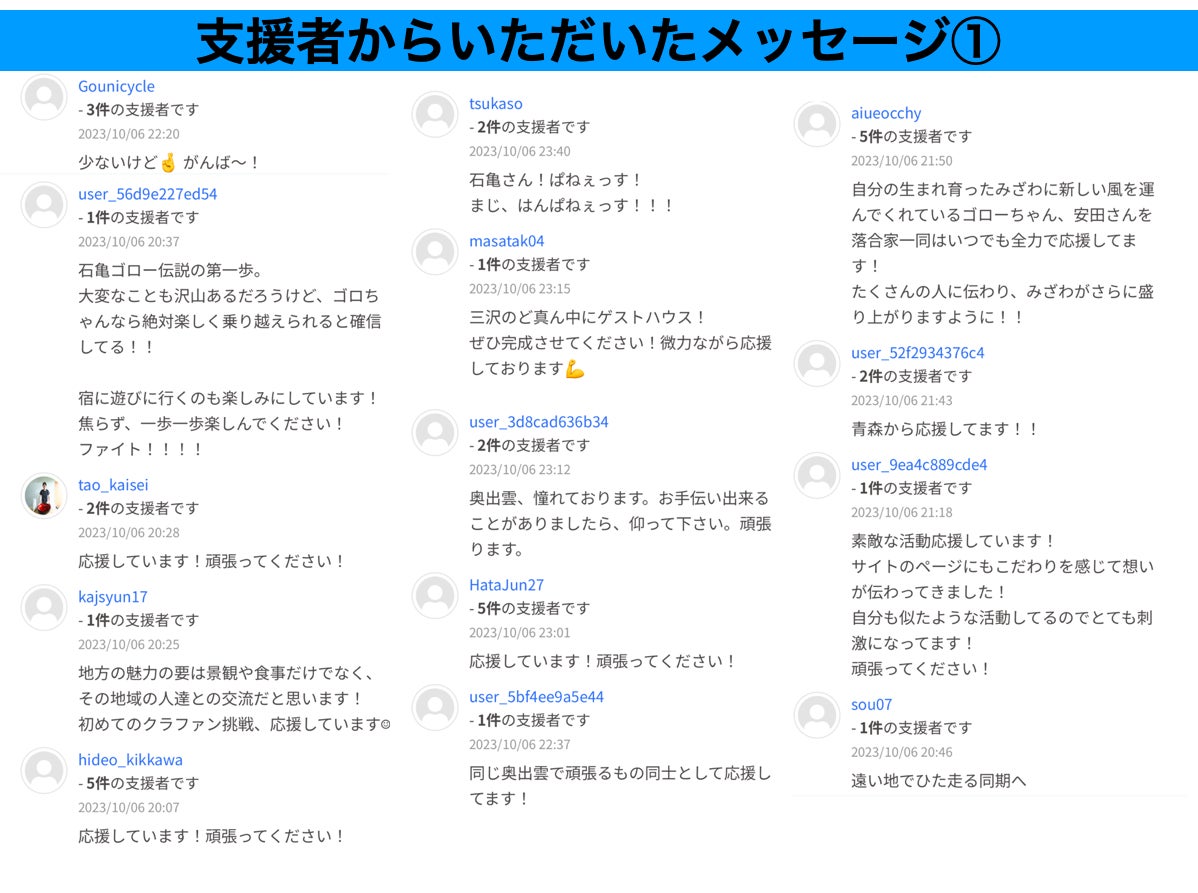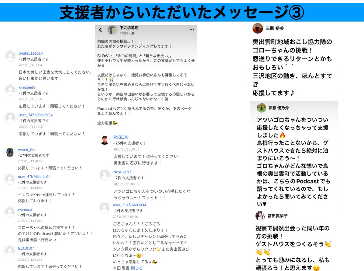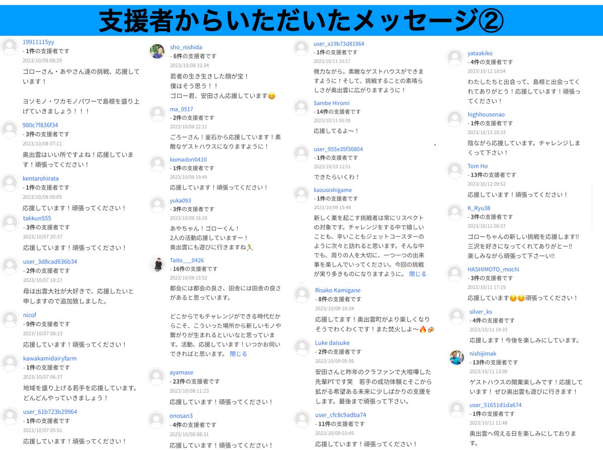 ご支援いただいた皆様、ありがとうございました!今回は支援者の皆様からいただいたメッセージをご紹介いたします!島根の方、中学〜大学の友人、協力隊仲間、前職の同期等からも。1つ1つのメッセージが力に変わります。本当にありがとうございます!!