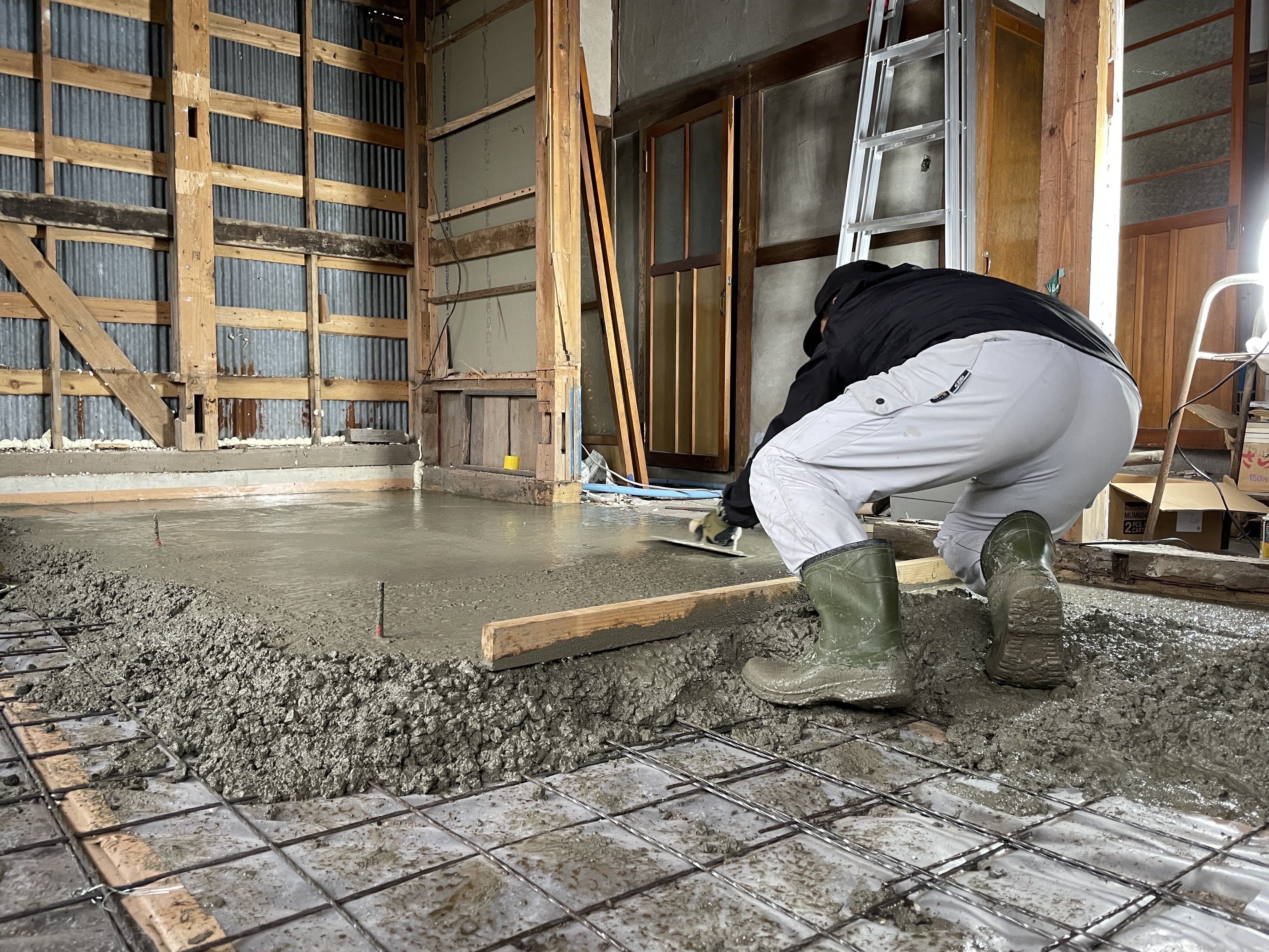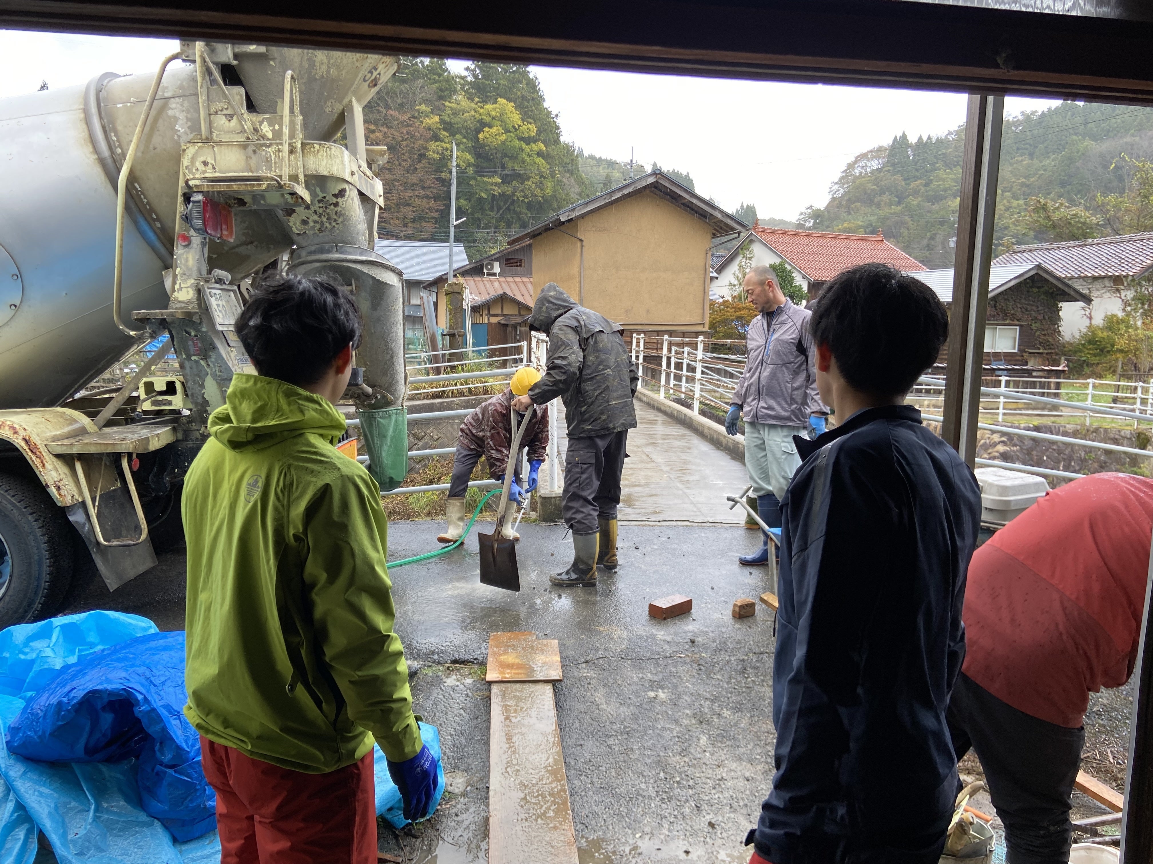 さて、クラウドファンディング最終日。実は施工作業も山場でした。雨の中、コンクリ打ちの作業でした。トラック3台分の生コンクリートを猫車で運び続ける根気のいる作業でした。
