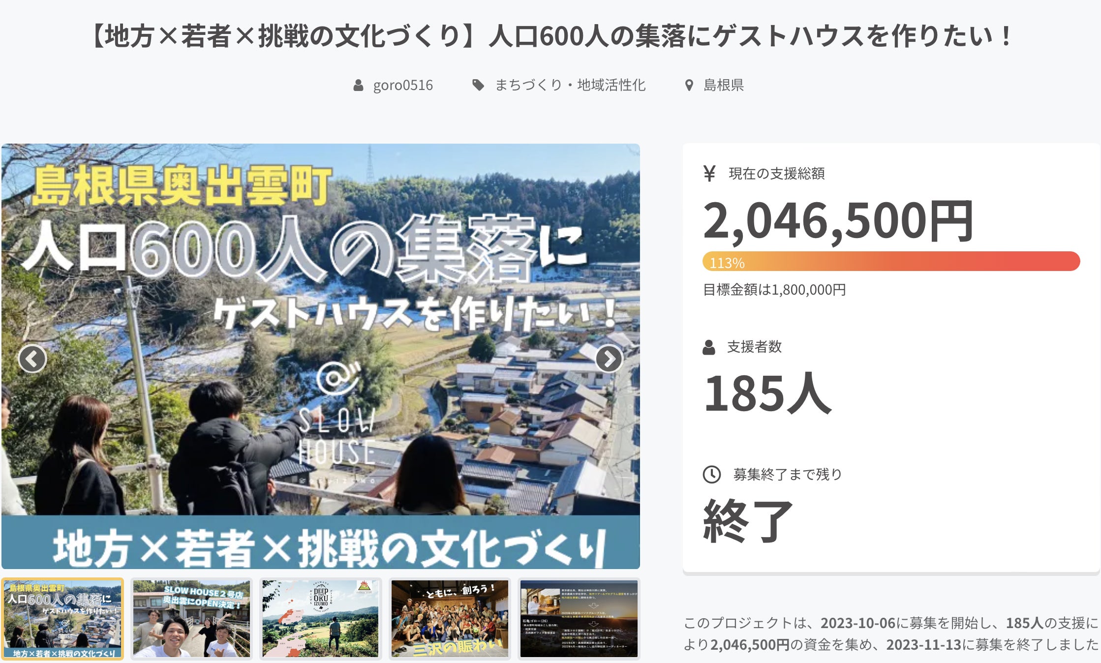 支援者185名から2,046,500円が集まりました!目標金額だった180万円を超え、113%達成となり大成功で終えました!ご支援いただいた皆様、本当にありがとうございました!