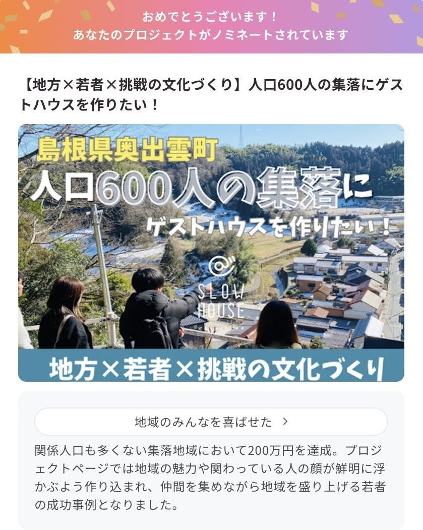 「関係人口も多くない集落地域において200万円を達成。プロジェクトページでは地域の魅力や関わっている人の顔が鮮明に浮かぶように作り込まれ、仲間を集めながら地域を盛り上げる若者の成功事例となりました。」