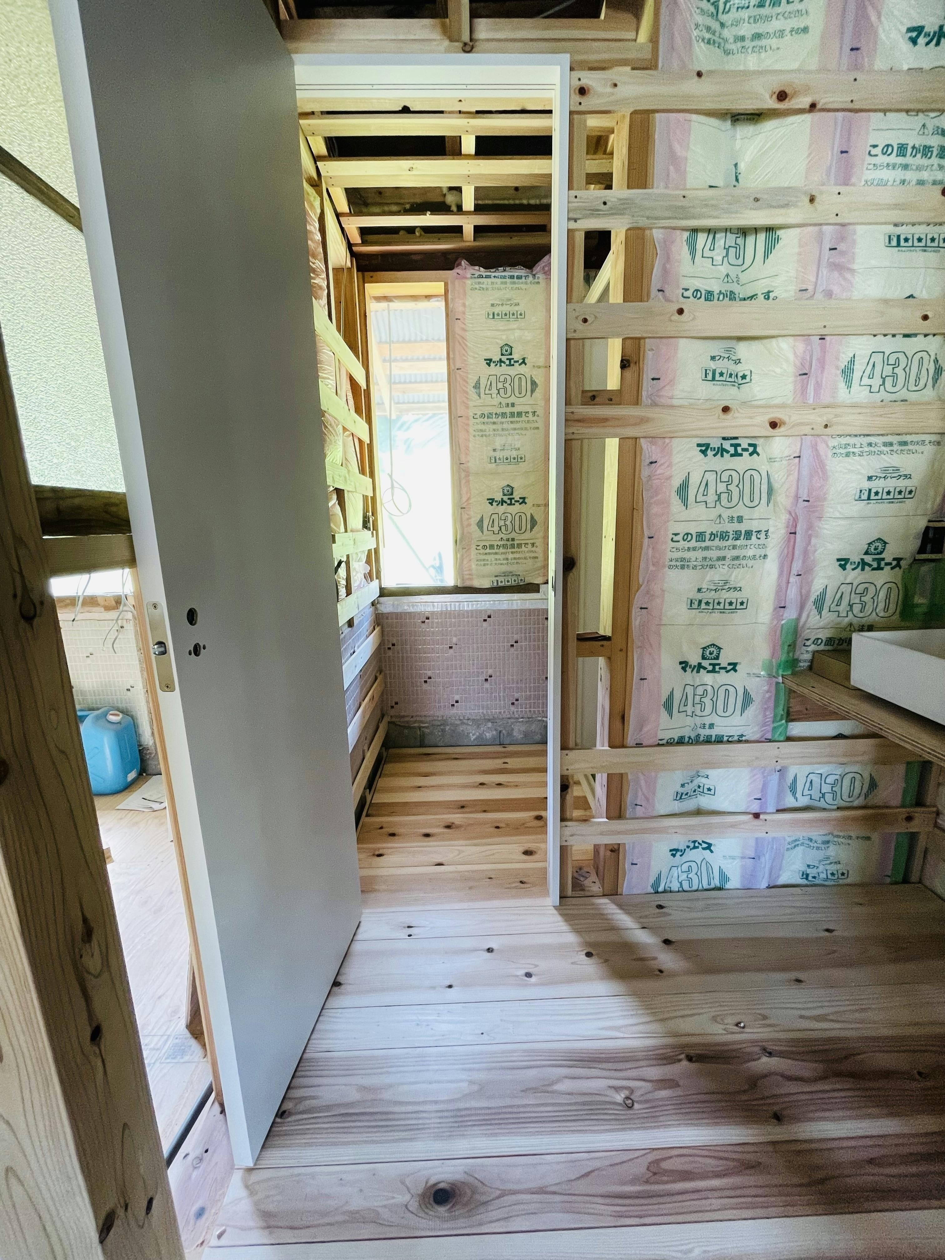 シャワーブース前の脱衣所から始まり、トイレ個室、洗濯室と進めていきました。