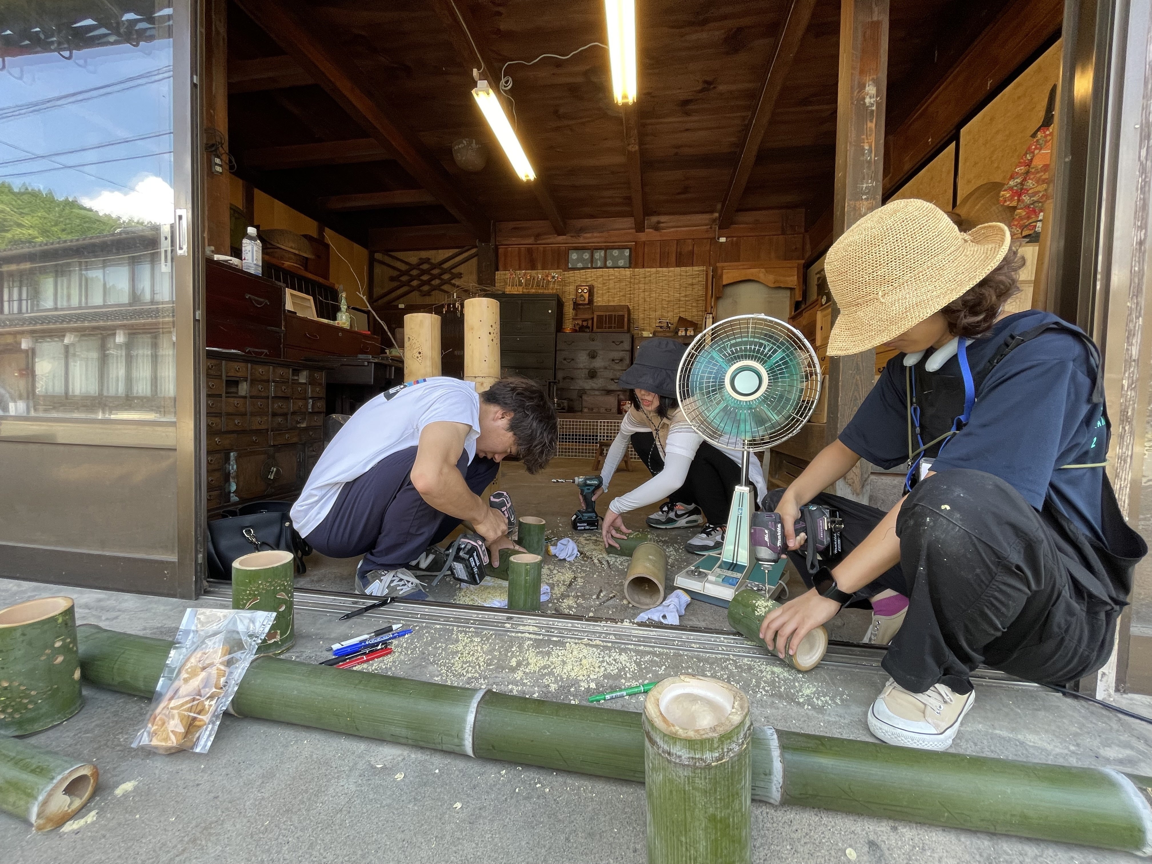 スロハ前にある橋にあかりを灯そうと、念願の竹灯籠作りも行いました!この期間中はやることが盛りだくさんの中、助っ人が来てくれました!