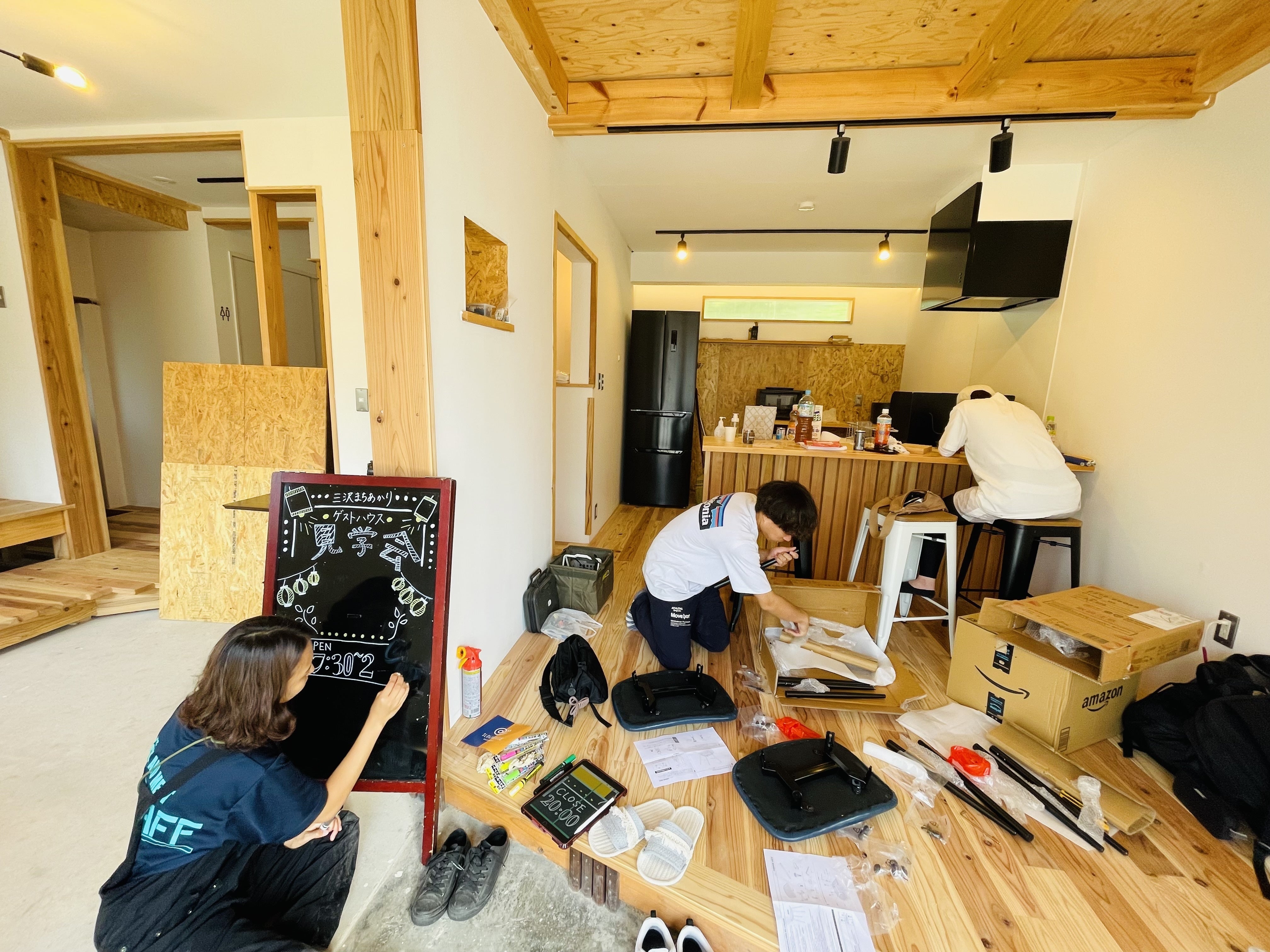 お祭り当日は午前中からがっつり作業。そして、今までの施工作業の様子を伝えようと、壁一面に写真を飾ったり、キッチン部分のニスを再度塗ったり、ドミトリールームのセッティングをしたり。みんなの協力のもと、なんとかお祭り本番に間に合わせることができました!