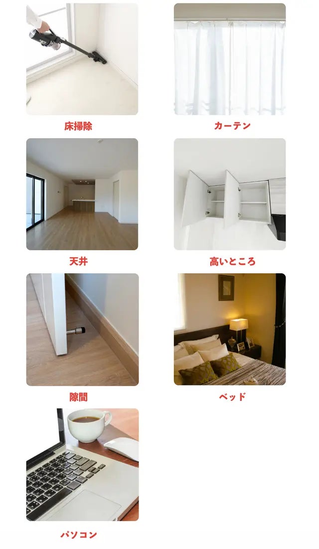 天井掃除や、隙間掃除など、普段の掃除では手が届きにくい場所のお掃除も楽々。