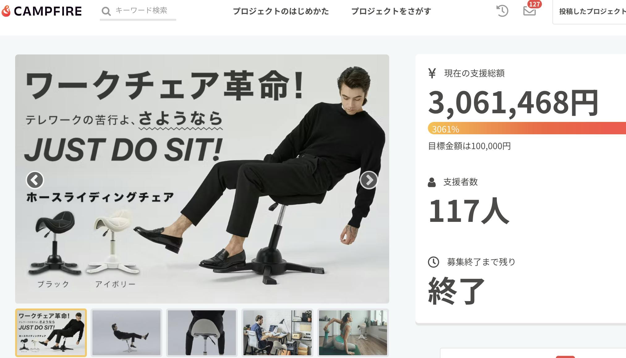私も1日中ずっと座っているのが辛くなり、新しいチェアを探していました。でも、なかなかしっくりくるチェアに出会えずにいました。そんな時、チェアマイスター社の「ホースライディングチェア」に巡り合いました。「ホースライディングチェア」はCAMPFIREで306万円、117人のサポーター様よりご支援いただき、大ヒットとなりました。
