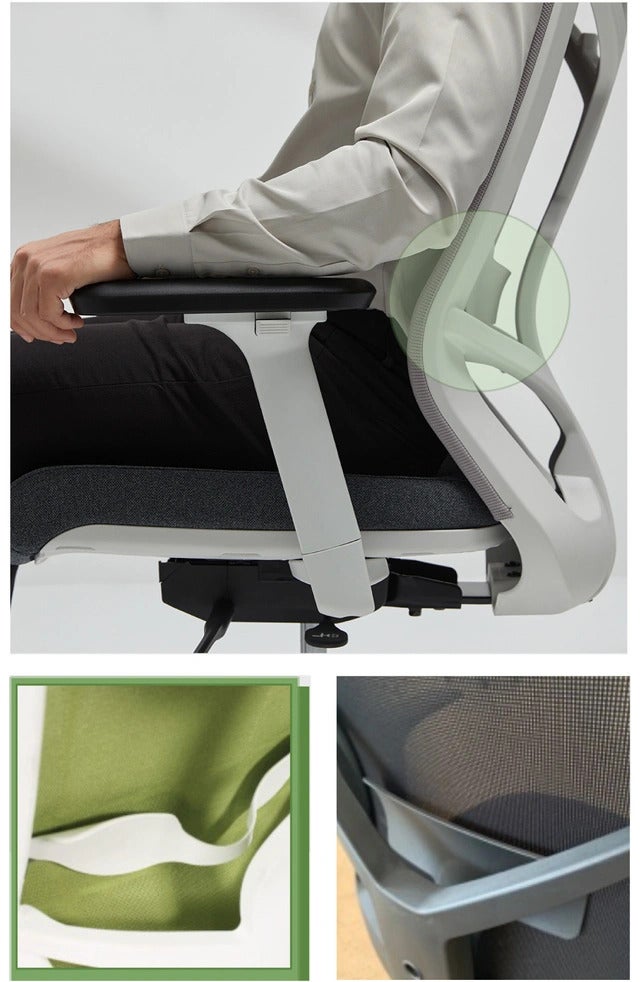 A3.「ワークチェア KAITEKI ナチュア」は腰を優しく支える仕組みが2つあります。可動式ソフトランバーは柔らかいプラスチックで、異なる姿勢や腰のカーブに合わせてフィット。腰全体を優しく支えることで、自然なS字カーブを保ちます。さらに新技術、Cカーブサポートは、背骨を圧迫せず、密着させる仕様。腰を優しく支え、腰への負担を軽減します。