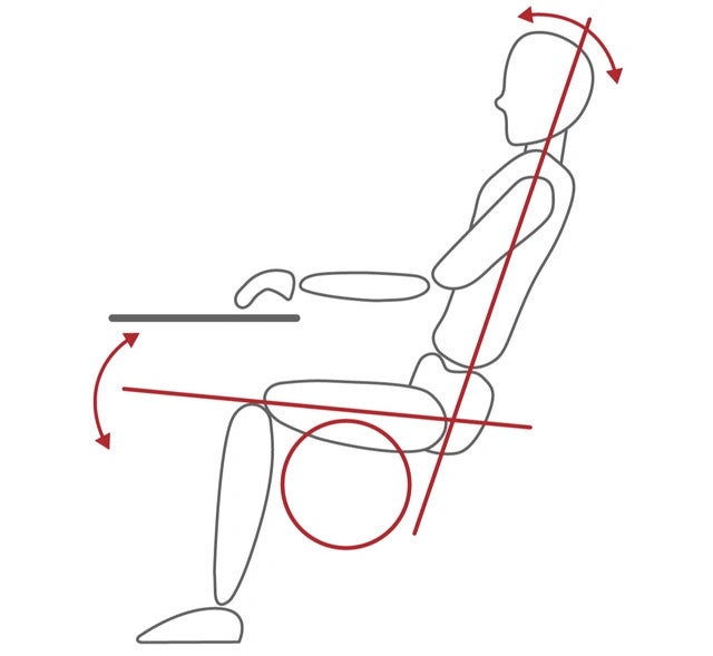 背もたれに寄りかかると、膝が自然に上がる、人間工学に基づいたメカニズムを採用。リクライニング時に腰に負担がかかりにくい。