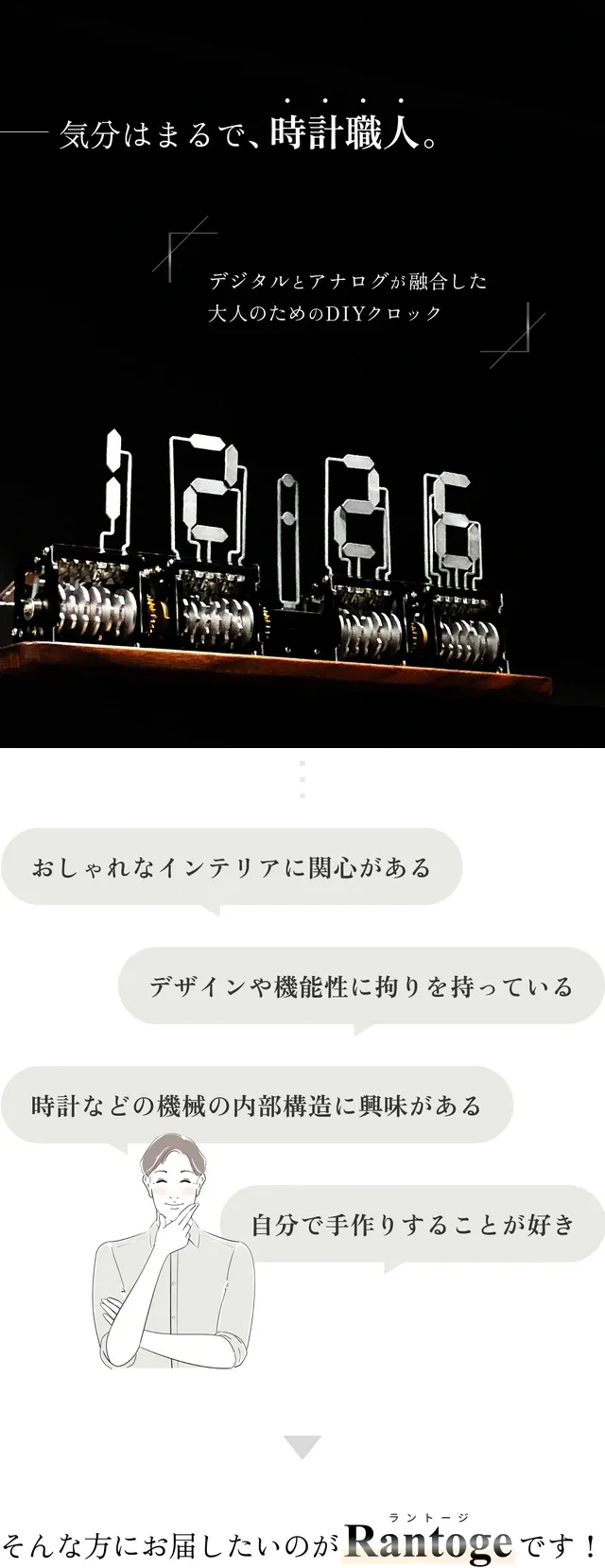 Rantogeは作る楽しみ、見る楽しみ、飾る楽しみ、すべてが叶うアイテムです。そこにあるだけで魅了されてしまう…。こんなにわくわくする時計は他にありません。