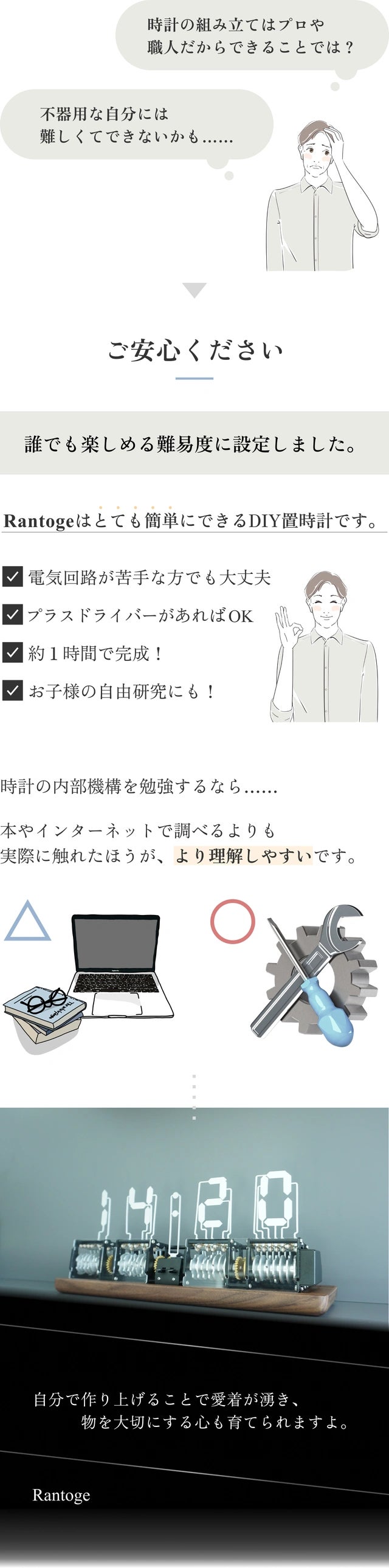 Rantogeは作る楽しみ、見る楽しみ、飾る楽しみ、すべてが叶うアイテムです。そこにあるだけで魅了されてしまう…。こんなにわくわくする時計は他にありません。