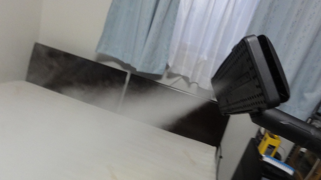写真の機材は一部の業者も使用しているスチームクリーナーとカーペットリンサー(ケルヒャー製)という機械です。決定的に水が使える量が少なく出力が小さいので、自社の実証ではこれらの機材では満足にベッドは洗えませんでした。