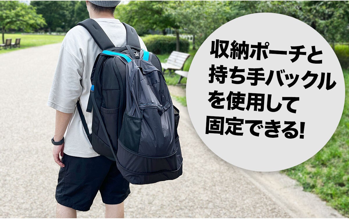 ラグビーボールやサッカーボール、バスケットボールも入るサイズ感なのでスポーツバッグとしても便利。拡張機能を使えば着替えやシューズを入れることも。