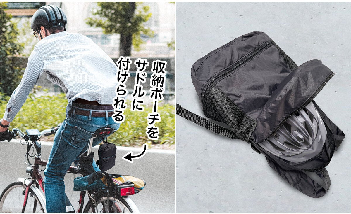 収納に困る自転車用のヘルメットもしっかり収納可能。収納ポーチはサドルにかけて持ち運べるので邪魔になりません。自転車乗りにもおすすめです。