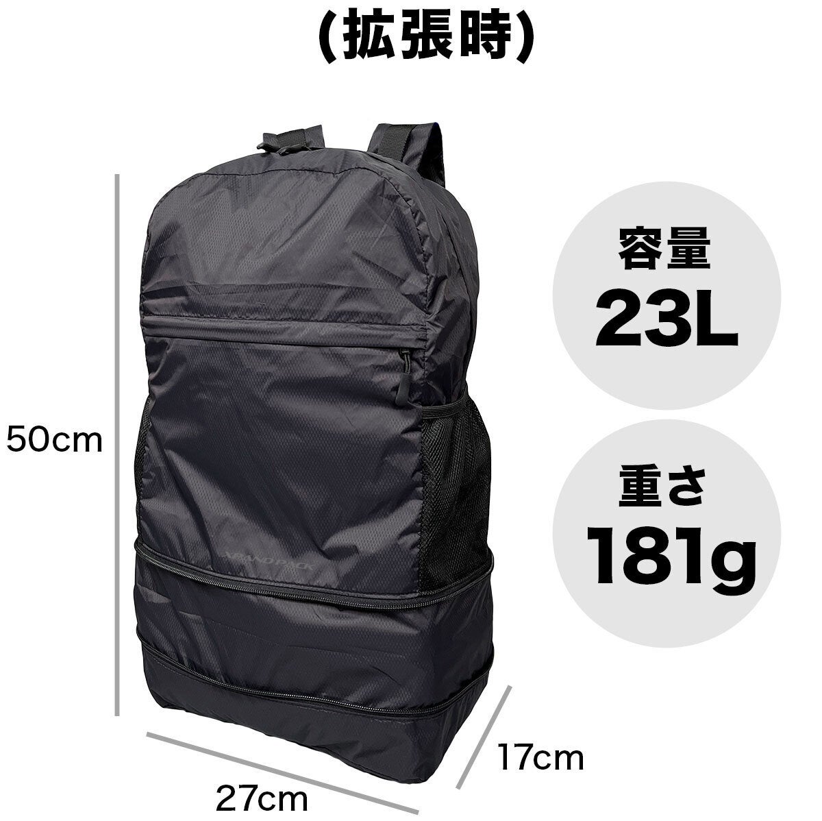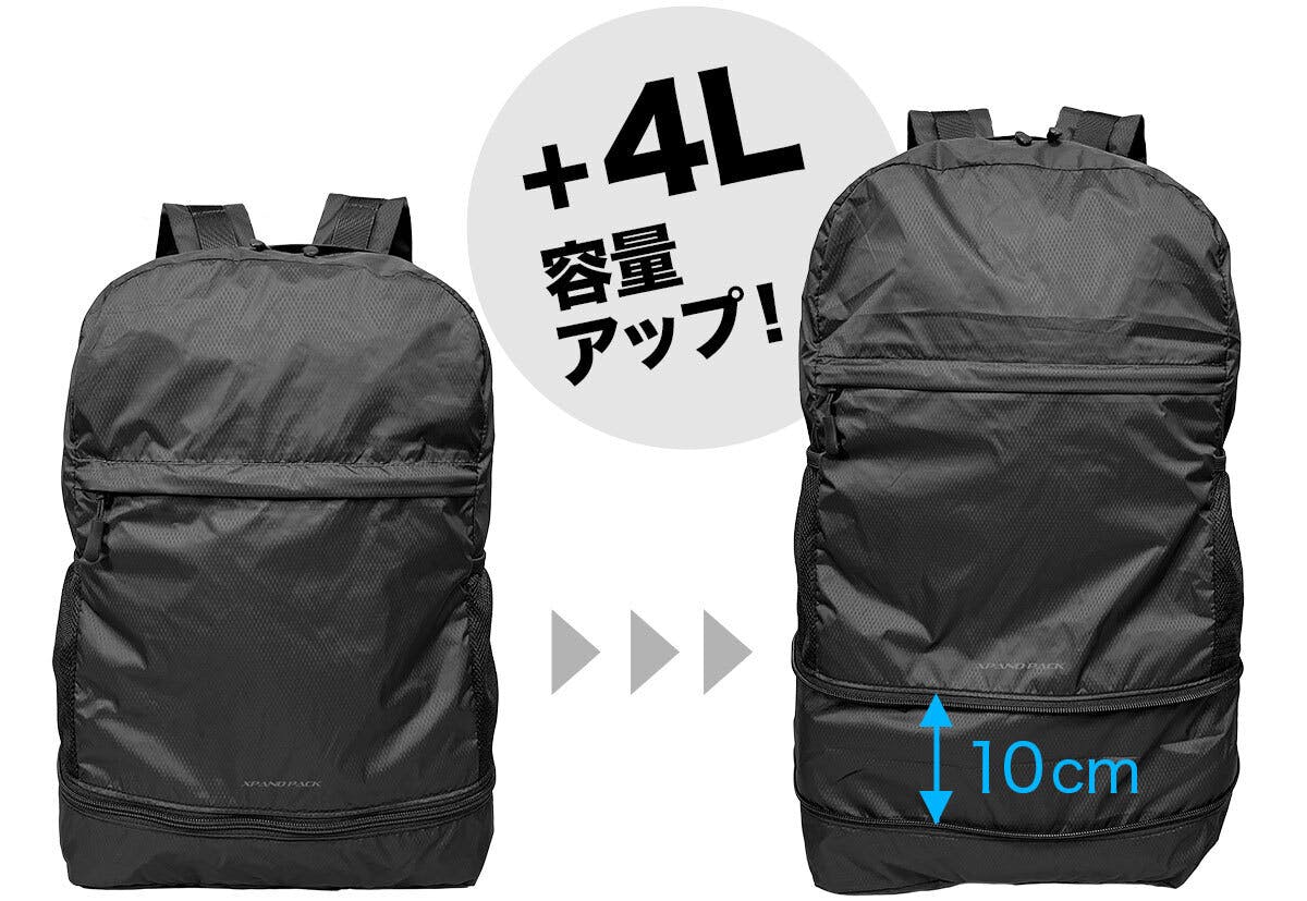 拡張機能で高さが10cm、収納が4Lアップします。予定外の荷物が増えてもしっかり収納できます。