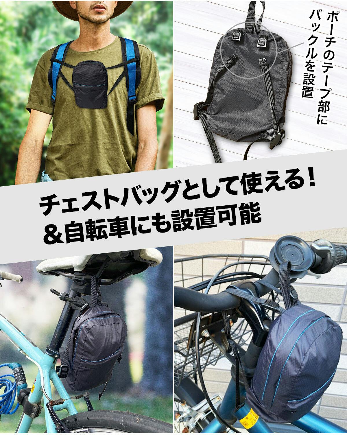 収納ポーチはチェストベルト&チェストバッグとしても使用可能です。ポーチのハーネステープで長さ調整も可能です。ポーチのバックルを活用することで多彩な取り付け方法を実現しました。