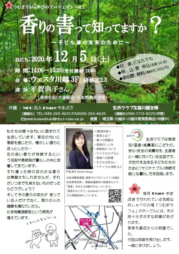 「つむぎCafe学びのプロジェクト(以下、「学びのプロジェクト」と称す)」は特定非営利活動法人Peaceやまぶき生活クラブ生協 川越支部、が、年に一度学習会を開催しようと2020年から始まった活動です。昨年からは子どもたちの健康を考える市民の会も一緒に取り組んでいます。