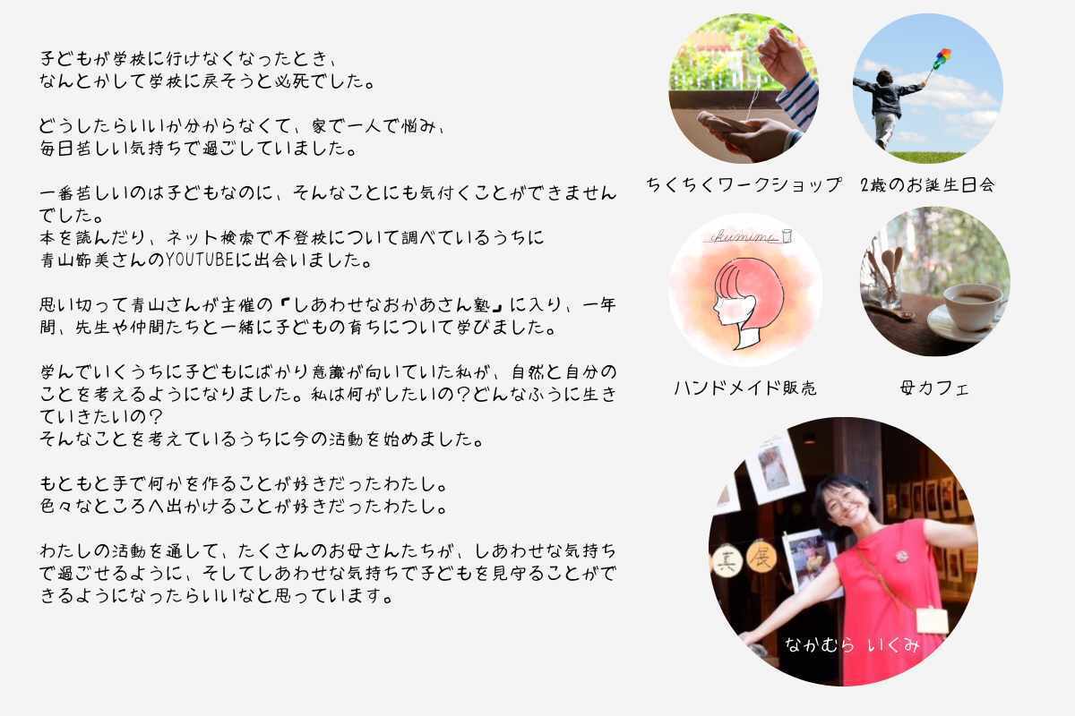 私が学んだ「しあわせな親子塾」の仲間と、もっと子育てを知ってもらいたいという想いで今回のイベントを立ち上げました。