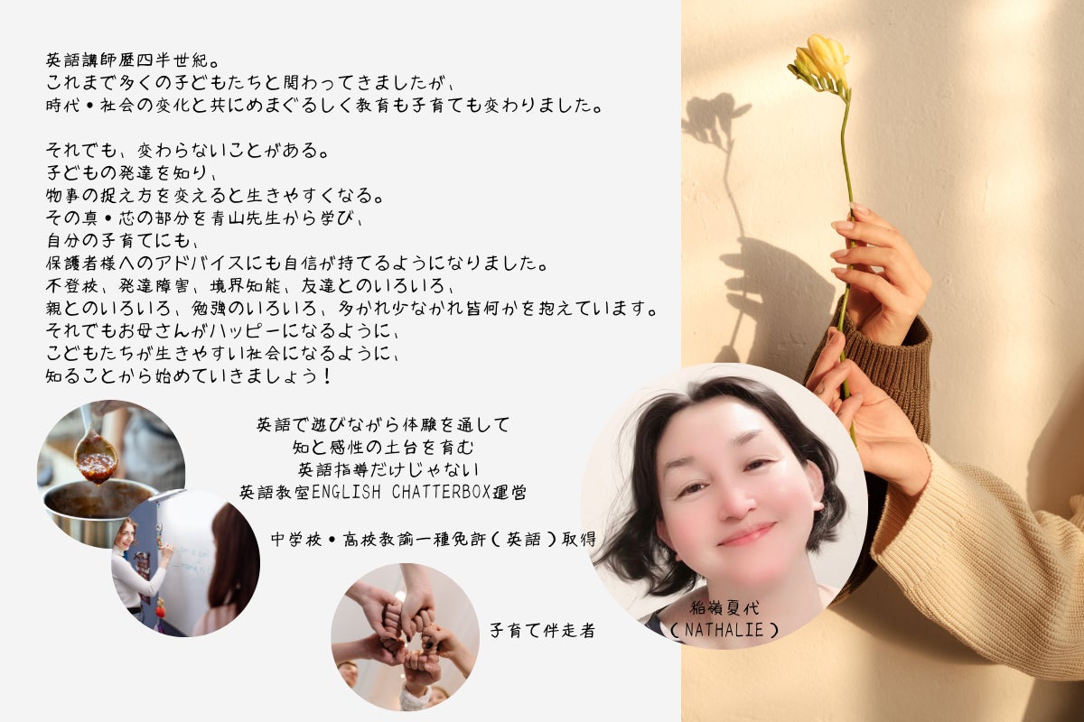 学習塾、英語塾、大手英会話学校勤務を経て、 英語で遊びながら体験を通して知と感性の土台を育む、 英語指導だけじゃない英語教室English Chatterbox運営 中学校・高校教諭一種免許(英語)取得、 「しあわせなおかあさん塾」卒塾後、 生徒たちや親御さん方の様々な悩み・問題に寄り添う 高2長女、中2長男の母